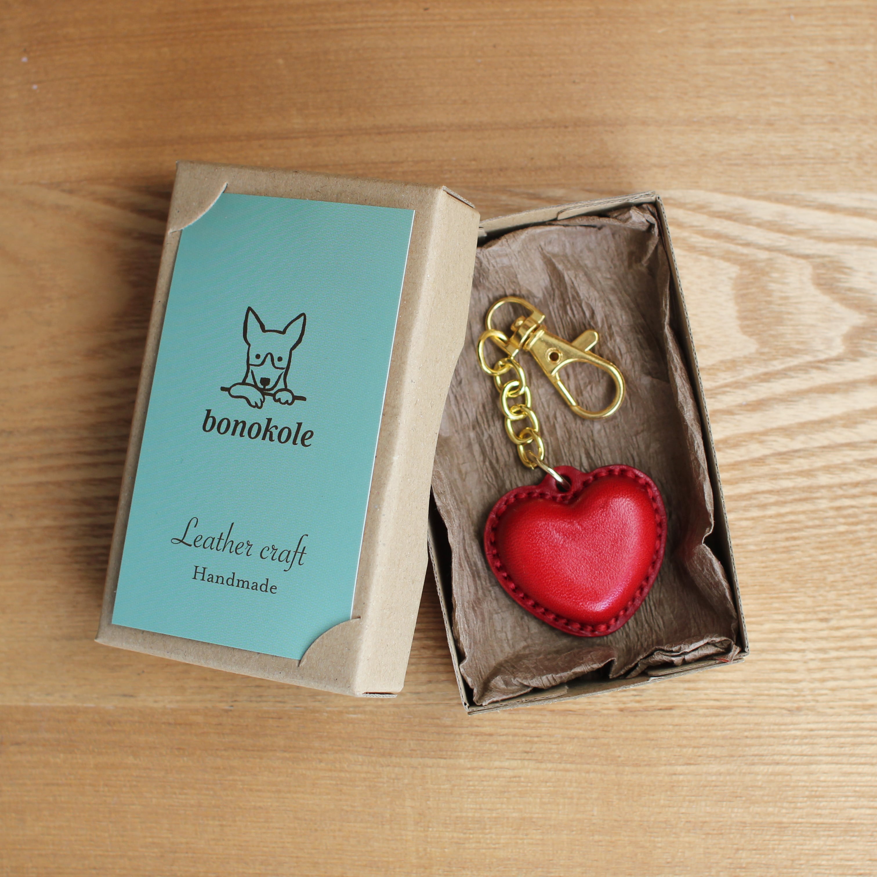 デザインは、ハートの形の赤いボンボンショコラをモチーフに、シンプルながら手にすっと収まる大きさで、経年変化が楽しめる革で製作しました。